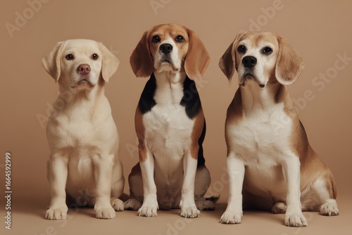 Three Adorable Dogs Sitting Together: A Golden Labrador and Two Cute Beagles Posing on Beige Background