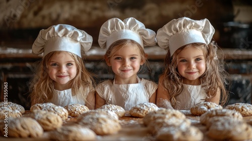 Three adorable little girls in chef hats and aprons, smiling, surrounded by freshly baked bread.
