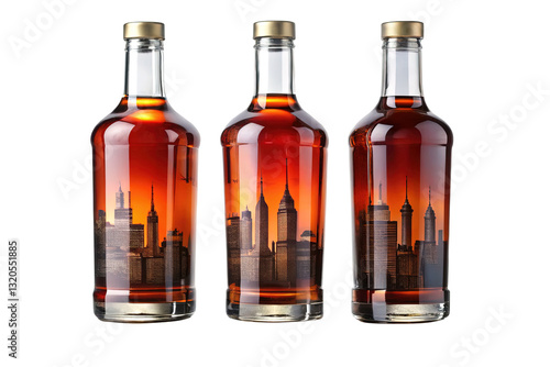 Three amber glass bottles showcasing a New York City skyline at sunset