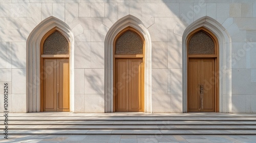door, wooden, arched, stone, wall, light, building, architecture, facades, entrance, three, sunlight, shadow, design, exterior, islam, mosque, arabic, pattern, detail, texture, surface, material, style, ornate, elegant, symmetry, geometric, modern, traditional, religious, faith, structure, step, stair, grey, brown