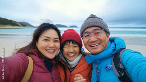 Three Asian friends smiling and posing for a selfie on the beach, radiating joy and companionship against the beautiful sea and sky backdrop.