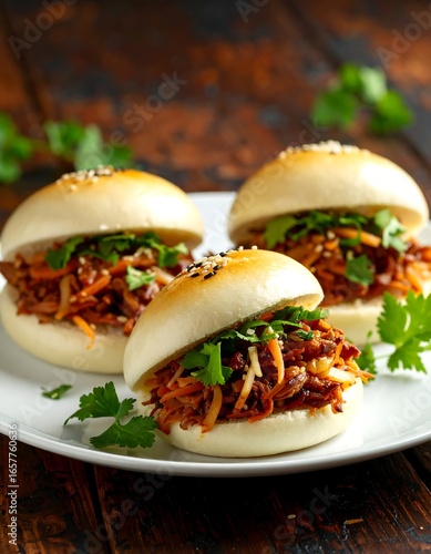 bun, sandwich, food, asian, filling, meat, vegetable, plate, white, brown, wooden, table, cookery, delicious, tasty, fresh, crispy, sesame, coriander, close, up, image, eatery, epicure, serving, healthy, homemade, lunch, dinner, meal