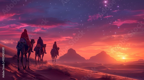 Three astrologers riding camels through a desert at dusk, the sky glowing in shades of pink and orange, soft light reflecting off the sand dunes,