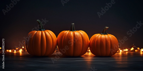 Three beautiful Halloween pumpkins on dark background with lights and candles.