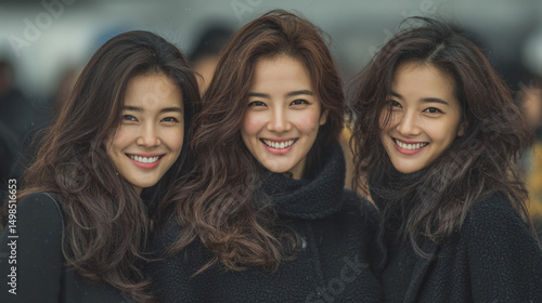 Three beautiful Korean women with strikingly similar features smile brightly against a modern city backdrop. Radiant aesthetic reflects beauty standards, plastic surgery culture, and urban lifestyle.