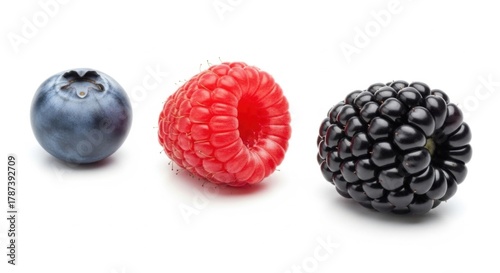 Three Berries on White Background, Blueberry, Raspberry, Blackberry