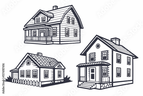 Three Black and White House Illustrations Depicting Distinct Architectural Styles with Different Roofs, Windows, and Porch Designs in a Row