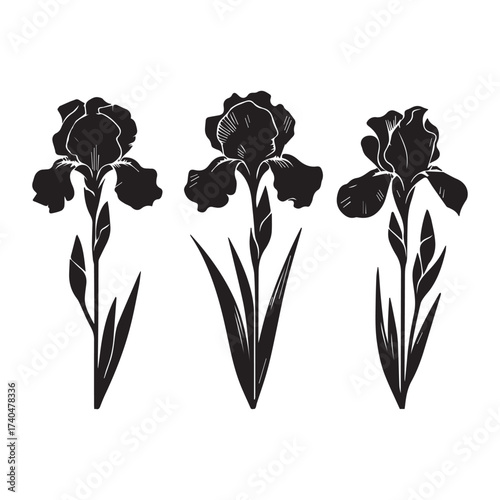 Three black silhouette iris flowers with detailed petal texture and stylized leaves on a white background