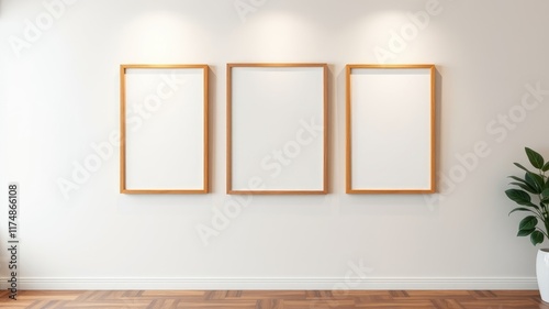 Three blank light wood frames on a white wall above a hardwood floor with a plant