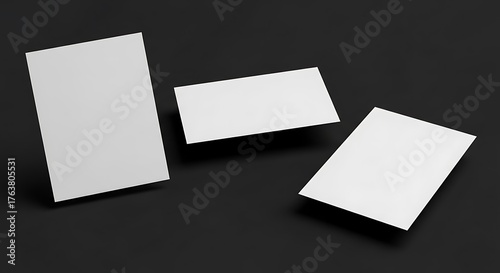 Three blank sheets of paper floating on a dark gray background, perfect for showcasing designs, mockups, or presentations with a minimalist and modern aesthetic