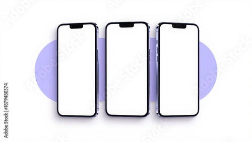 Three blank smartphones on a light purple background
