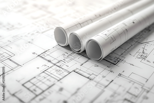 Three blueprints with white paper rolls on top, representing architectural and design concepts.