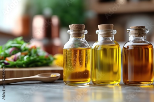bottle, oil, kitchen, counter, salad, ingredient, cooking, food, glasses, cork, dressing, olive, healthy, fresh, culinary, nourishment, epicure, preparation, dining, liquid, vinegar, vegetable, virgin, cookery, wood, spoon, clean, shiny, appetising, seasoning, aromatic, edible, pour, organic, lifestyle, homemade, table, jar, trio, uncooked, tableware, bright, indoor, reflective, arrangement, health