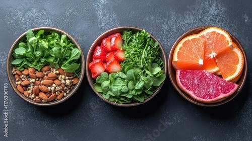 Three bowls of fresh fruits, nuts, and greens arranged on a dark surface.