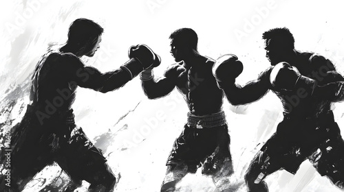 Three boxers intensely engaged in a dynamic boxing match, silhouettes against a bright background.