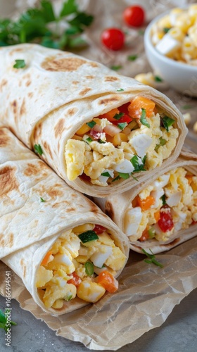 Three breakfast wraps are stacked. They are filled with fluffy scrambled eggs, chopped vegetables, and fresh herbs. Soft, natural light illuminates this delectable meal
