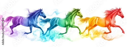 Three brightly colored horses were running. It features green, blue, purple, and orange smoke on a white background