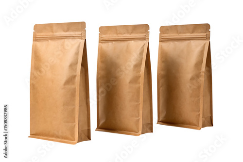 Three brown kraft paper food packaging bags mockup on transparent png background
