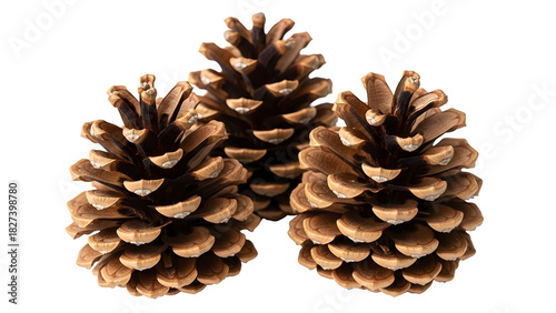 Three brown pine cones, detailed with open scales, isolated on a white background.