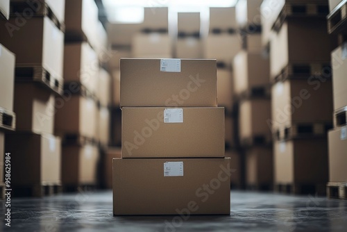 cardboard, box, box, stack, stacked, warehouse, floor, storage, shipping, delivery, brown, label, label, tape, paper, manufacturing, industry, logistic, shipment, product, good, material, package, package, distribution, inventory, depot, business, economy, commerce, trade, freight, transportation, industrial, commercial, order, facility, building, structure, concrete, aisle, row, pallet, pallet, space, empty, grey, light