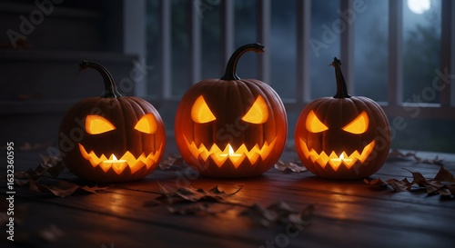 Three carved glowing pumpkins sit on a porch surrounded by fallen leaves under a full moon