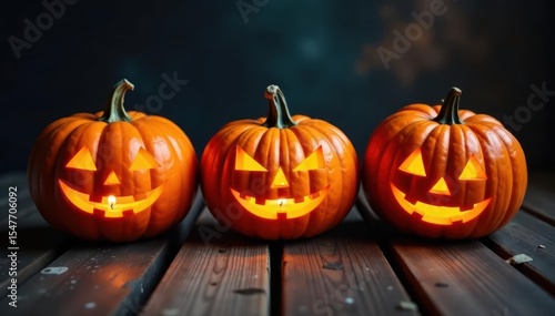 Three carved pumpkins with flickering candlelight on weathered wood surface , surface, shadow