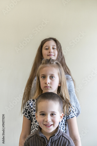 Three children stand in a row. Two girls and a boy. Brother and two sisters