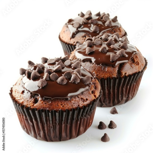 Three chocolate cupcakes are sitting on a white background, covered with chocolate chips and glaze