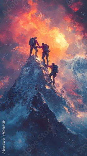 mountain, climber, summit, peak, adventure, success, teamwork, achievement, mountain chain, mountain, landscape, nature, outdoors, extreme sport, challenge, goal, inspiration, perseverance, determination, hope, journey, aspiration, travel, exploration, wilderness, sky, cloud, snow, ice, rocky, rugged, majestic, breathtaking, beauty, dramatic, epic, powerful, atmospheric, scenic, beautiful, wild, raw, bold, intense, high-coloured, vibrant, dynamic, abstract