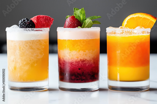 Three colorful fresh fruit cocktails with garnishes on a white table