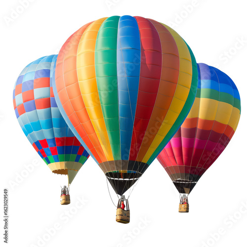 hot, air, balloon, colourful, vibrant, three, flying, aerial, patterned, red, orange, yellow, green, blue, purple, fabric, decorative, festive, summer, vacation, travel, tour tourism, celebration, event, design, pattern, diagonal, geometric, basket, rope, flight, adventure, upward, high, sky