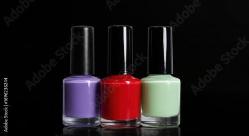 Three colorful nail polish bottles arranged against a dark background