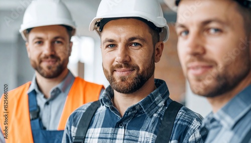 Three Construction Workers in Hard Hats. Professional construction worker with beard wearing safety helmet and uniform.