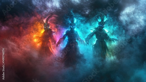 figure, mystical, trio, fantasy, colourful, smoke, powder, dark, mysterious, ritual, spiritual, glowing, illuminated, vibrant, energy, powerful, majestic, dramatic, intense, atmospheric, haunting, aethereal, ancient, folklore, costume, headdress, feather, masked