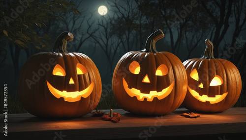 Three creepy jack-o'-lanterns glowing in the dark forest, surrounded by candlelight and mist, create a spooky Halloween scene