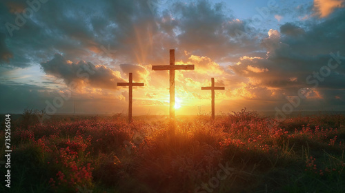 Three crosses up on a hill at sunset, Crucifixion of Jesus Christ concept