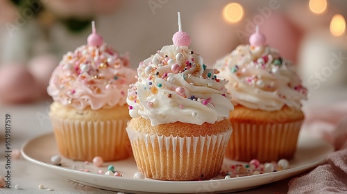 cupcake, frosting, sprinkle, dessert, sweet, food, baked, treat, vanilla, cake, plate, bakery, delicious, sugar, celebration, party, candle, pink, white, pastry, epicure, holiday, still life, closeup