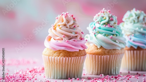 Three cupcakes with pastel frosting and sprinkles on a pink background close up view delicious treat