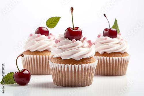 three, cupcake, white, frosting, cherry, top, dessert, food, cupcake, sweet, epicure, freshness, closeup, fruit, baked, icing, berry, muffin, chocolate, strawberry, indulgence, decoration, candy, pink, colours, snack, raspberry, sugar, birthday, ai, generative