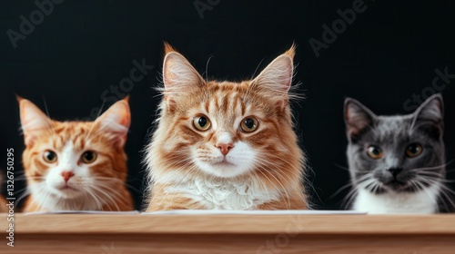 cat, felino, animal, pet, domestic, orange, grey, ginger, fluffy, adorable, curious, young, portrait, studio, three, friends, face, eye, whisker, meow, playful, companionship, sitting, background, calm, cute, fur, charme, innocence, happiness