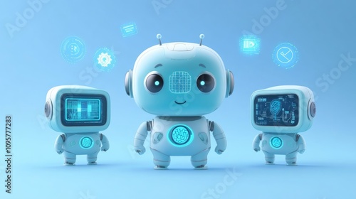 Three cute robots, digital assistants, teamwork, technology, AI.