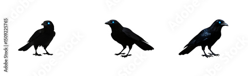 Three dark ravens with glowing blue eyes, cut out transparent