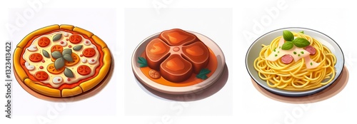 Three dishes are displayed: a round pizza with toppings, a plate of cooked meat, and spaghetti with sauce and basil leaves, all presented on white plates.