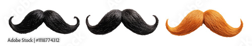 Three distinct fake mustaches in black and orange color, isolated on transparent background. Fashion accessory and costume concept