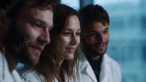 Three diverse scientists in lab coats collaborating and smiling in a bright cool lit laboratory setting