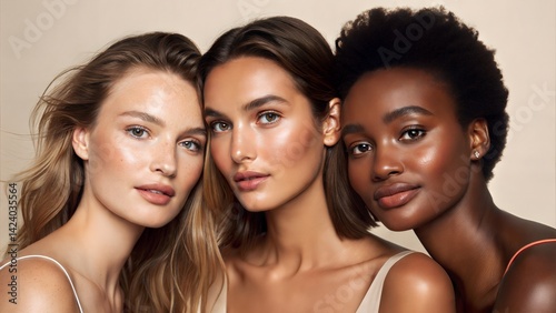 Three Diverse Women with Glowing Skin Posing Together for Skincare Campaign, Radiant Beauty Portrait on Beige Background