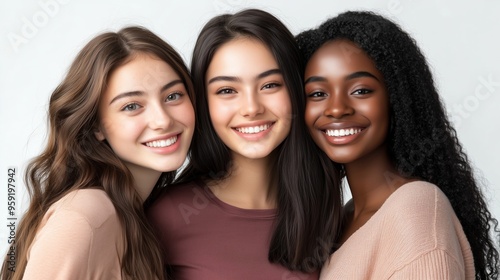 Three diverse young women smiling together, showcasing friendship and joy in a bright studio setting