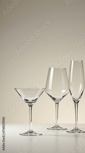 Three elegant, empty wine glasses martini, red wine, and champagne arranged on a minimalist white surface against a soft beige backdrop. Clean lines, modern design, ready to celebrate or savor.