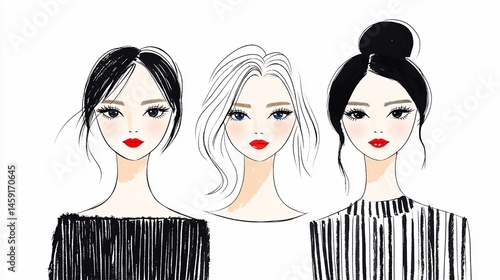 Three Elegant Female Portraits Black and White Fashion Illustration