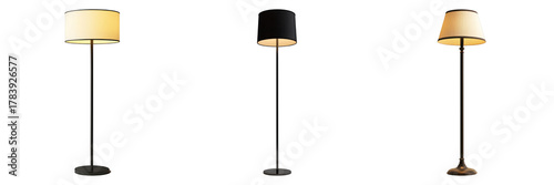 Three elegant floor lamps with different shade colors. The lamps stand tall, providing warm illumination